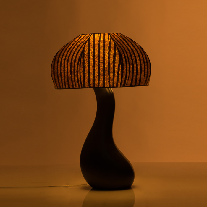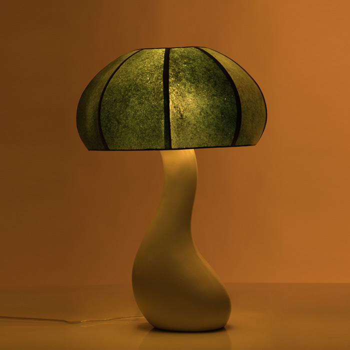 The simple shape of mushroom transforms with the light. The hidden motif on the lamp shade gives the mushrooms a mysterious effect as a magic light when it is turned on.